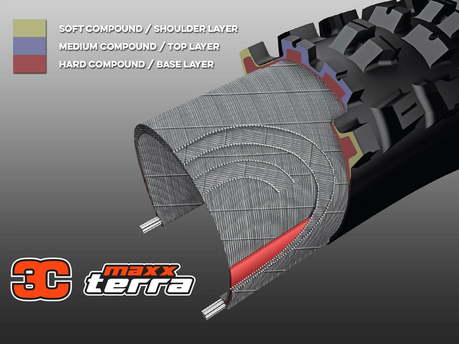Le composé 3C idéal pour les pneus Enduro et Freeride. Une conduite sans peine en montée et une bonne adhérence en descente ainsi qu’une longue durée de vie caractérisent ce composé. La surface de roulement 3C de Maxxis est formée d’une seule pièce constituée de trois composés de caoutchouc différents, et non pas de deux bandes assemblées ultérieurement. Les surfaces de roulement peuvent ainsi être formées exactement suivant les exigences de chaque modèle de pneu, permettant ainsi d’optimiser les caractéristiques de conduite.